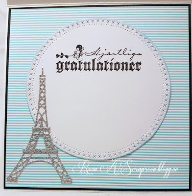 På insidan gjorde jag så här. stämpel från Vilda stamps. Eiffeltornet har jag stansat ut i silverglittrande och självhäftande papper med en die från Marianne Design.